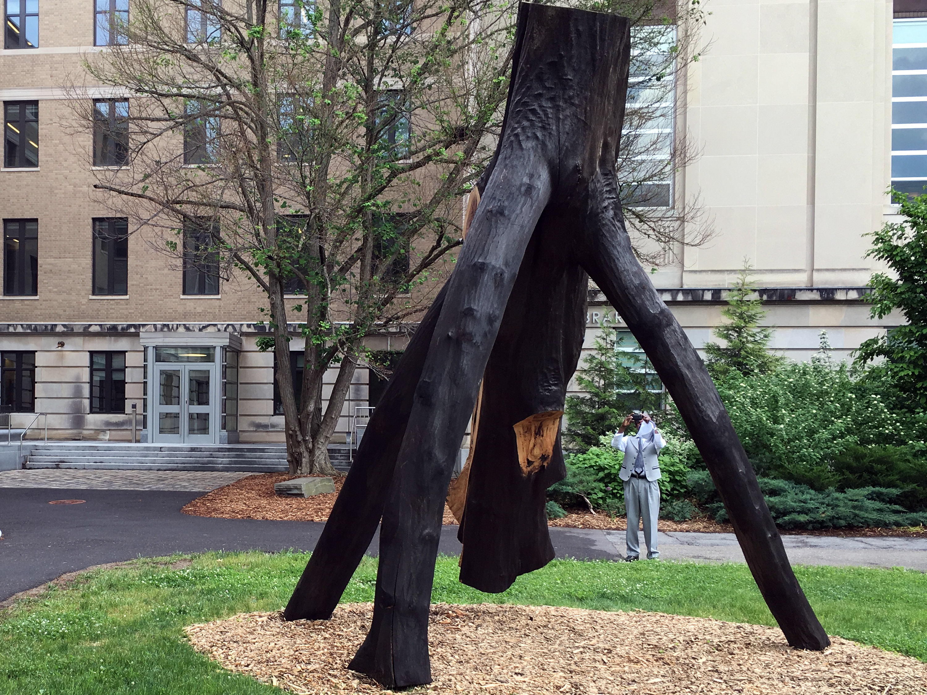 "Betula Ionica" is Latin for "Ionic Birch", referencing its columnar form and its Ionic proportions of 1:9, base diameter to height. In between the nine drums are black disks made from Baltic birch plywood of diminishing diameters as they are repeated upwards, outlining an actual classical column, following the rule of "entasis" or tapering, mimicking the actual tapering of a tree. Together, the natural and the human-made forms produce a rusticated Ionic column, the classical order associated with the proportions of the older woman, the matron.