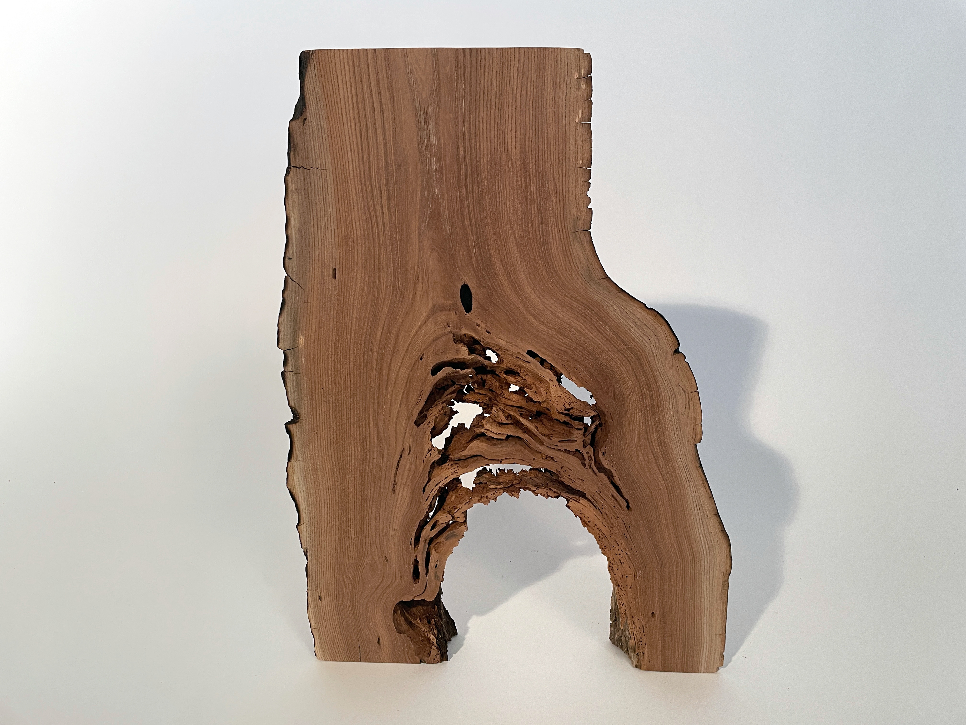 “Corrodo” is Latin for “to gnaw, to eat away”. The action of insects and fungi have produced this lacey structure in the crotch of the tree, where the trunk splits into two equal branches. Inverting the crotch allows the piece to reference the human torso, a common theme in figurative sculpture.